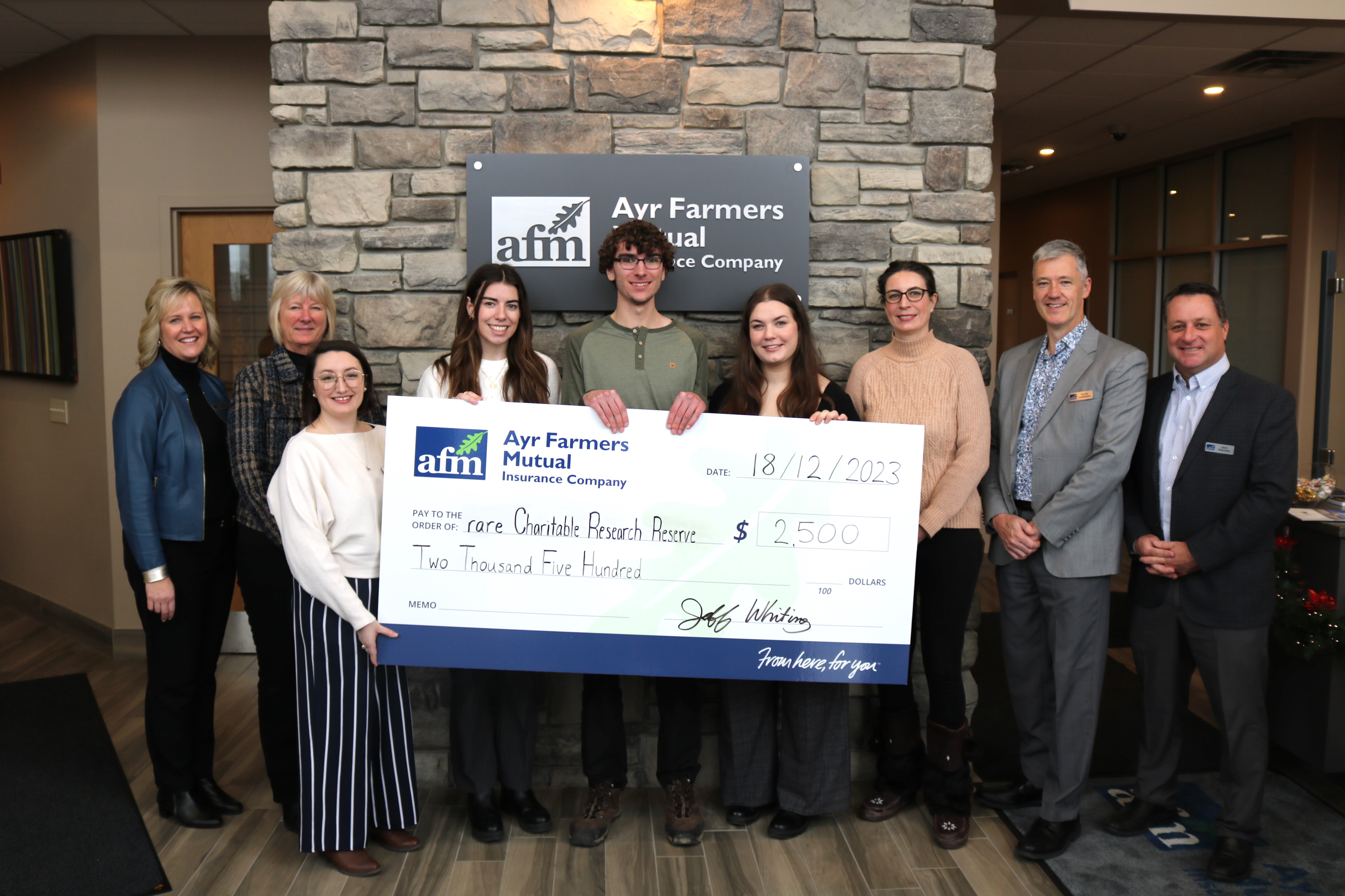 In 2023, our scholarship topic asked students “If you had a budget of $10,000, what environmental causes and organizations would you recommend Ayr Farmers Mutual invest in or donate to in our local community?” to which we were delighted to donate over $26,000 to 39 deserving students. Based on the recommendations of the students and in alignment with our company values, we selected four environmental organizations to receive a donation of $2,500 each. The selected organizations are Sustainable Waterloo Region, Grand River Environmental Network, rare Charitable Research Reserve and Waterloo Region Nature.